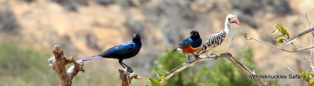 Ruppell's Long-tailed and Superb Starlings and Red-billed Hornbill. |