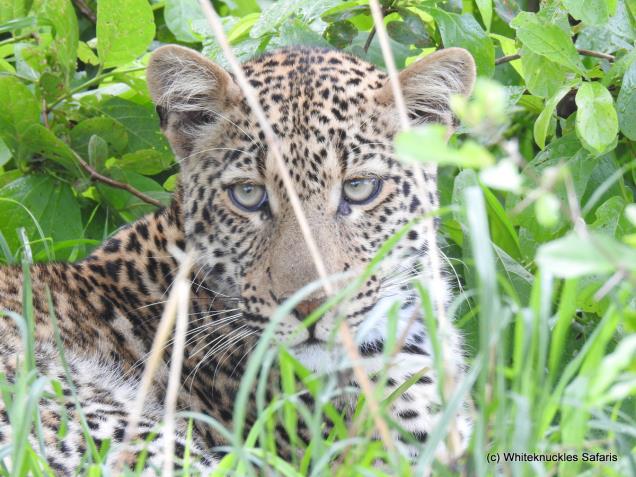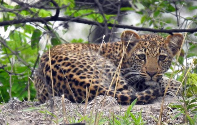 Leopard cub peering at us. |