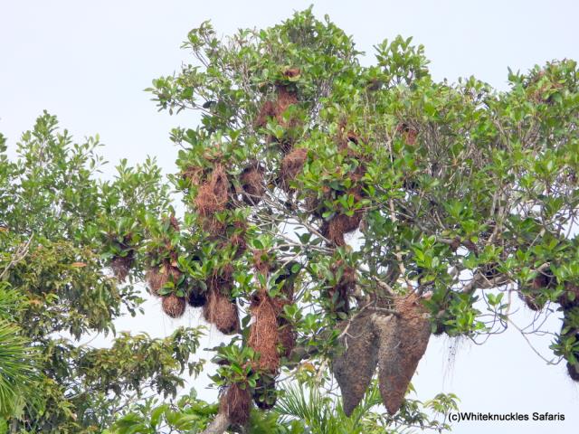 Nests of Russet-backed Oropendolas. |